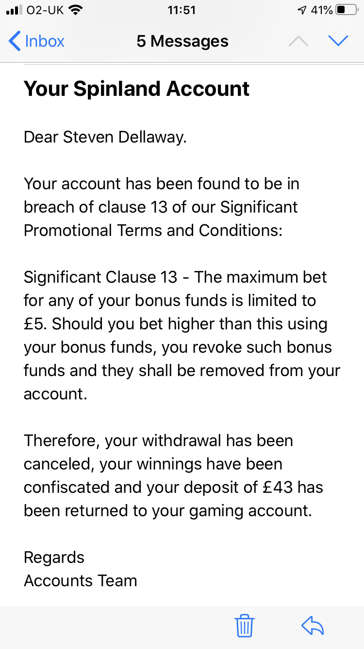 Well I have quiet the experience over the weekend with a sister casino of Jonny jackpot and captain spins, it’s know as Spinland deposited 20 pound and got 100% match offer cash funds ran out almost straight away so was plodding through wagering hit moon princess on a pound went for 228 quid so was quiet happy played a few other games and the went to who wants to be a millionaire mystery box on 50p to start off was playing alright so upped it to a pound hit the bonus got to the 50x in the bonus payed 420 quid so smashed through couple more games on similar 1-2 pound stakes anyway got through the wagering finished on 595.47 withdrawl request of 550.47 and yes I took the 47p so sat content waiting in this time of self isolation thinking well I’ve got that money in the bank but then this happened