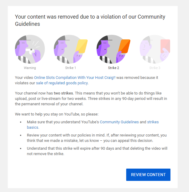 The channel now has 2 strikes, i cannot upload for 2 weeks & one more strike is a permanent ban from the platform.